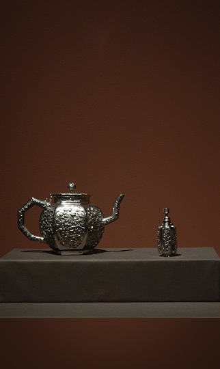 His attribution was based on the London hallmarks stamped on the base. In reality, it was made in China and sold in London by a silversmith who added his own mark. The teapot and the scent bottle to the right were cast rather than engraved. Such high-relief decoration does not appear to have influenced English Chinoiserie silver. As seen on the pieces around the corner, London silversmiths used simpler flat-chased imagery.