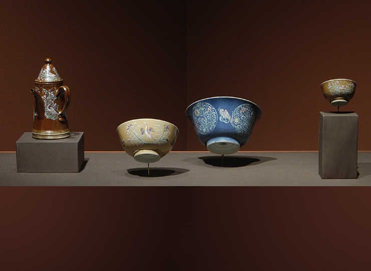 Professional enamellers in London, many of them Dutch or German, specialized in adding hand-painted decoration to finished pottery and glass. The vessels shown here are a mix of English stoneware and imported Chinese porcelain wares, all adorned with colorful Chinoiserie enamelling. Most include the image of the long-necked "hoho" bird, a mythological animal derived from the Japanese phoenix, and exuberant flora similar to the decoration chased into silver, embroidered in silk, and varnished on japanned furniture.