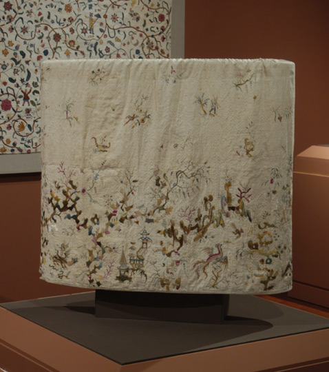 This skillfully embroidered petticoat is adorned with a remarkable range of Chinoiserie motifs: fantastical foliage, pagoda-roofed buildings, and colorfully-dressed figures riding on elephants and dragons. A rainbow-colored stripe that meanders over the entire surface provides an alluring background and probably depicts a "scholars rock," an unusually shaped geological formation that Chinese thinkers used to contemplate the power of nature. Scholars rocks were commonly depicted on Chinese porcelain and also widely copied by European designers who were unaware of its symbolic importance.