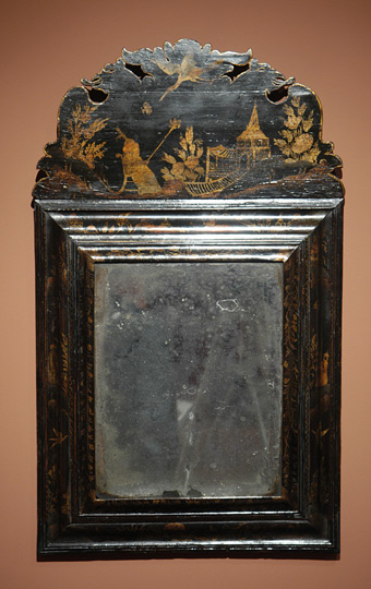 Chinoiserie designs often feature a lone figure in an exotic landscape similar to the scene on the crest of this mirror. This popular motif may be related to the notion of sharawadgi and Sir William Temples interest in the ancient Roman philosopher named Epicurus. Epicurianism, which gained some popularity in late seventeenth-century England, embraced the belief that life should be centered around the pursuit of pleasure and the avoidance of pain. To this end, followers advocated contemplative seclusion in naturalistic settings.
