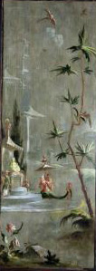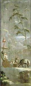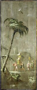 Robert Robinson painted wildly imaginative landscapes for merchant houses in London. The three paintings seen here were part of a series of eleven panels that decorated an entire room, providing glimpses at every turn into an outlandish world of rich costumes, fantastical vehicles, and lush foliage.