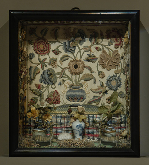 Schoolgirls from prosperous English families were expected to master the art of sewing. The three-dimensional work mounted inside this box probably marked the pinnacle of a girls education. This example is dated "1712" on the vase and is signed "MB" on either side. While the large flowers, wrapped-wire deer, and other decoration appeared frequently in needlework from this era, the tiny Chinese porcelain vases in the foreground make this box highly unusual. Like the exotic shells and natural debris installed inside the box, the porcelain vases were curious foreign objects worthy of commemoration in this miniature "cabinet of curiosities."
