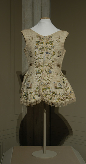 In their bedchambers ladies wore informal attire as they sat at their dressing tables and toilet mirrors. A tight-fitting waistcoat like the example seen here was a casual alternative to the stiff corset worn when fully dressed. The embroidered Chinoiserie figures featured on this waistcoat might have matched the playful spirit of other decorative items in the bed chamber like a japanned toilet set or chest of drawers.
