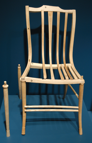 Once the parts are all together, the interfaces and dovetail joints of the seat and back are blended with scrapers and files into a smooth, continuous surface and the chair is ready to be painted.