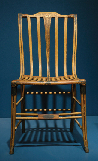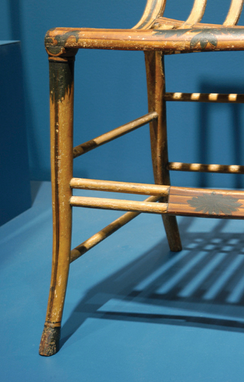 Graggs innovative bentwood chair construction included an unusual adaptation of a traditional joinery technique: dovetails. These fan-shaped interlocking joints connect the steam-bent elements on the back and seat to the horizontal pieces of the chair frame. Each dovetail is then secured with a small nail. In the early nineteenth century, dovetails rarely were used in chairs, but commonly joined the large boards in chests of drawers, desks, and other pieces of case furniture.