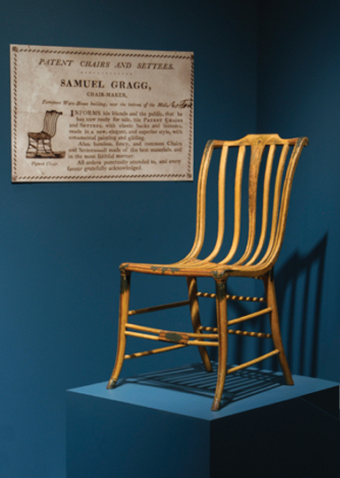 Like other artisans of the era, Gragg used an engraved trade card to advertise his wares. The text emphasized the fact that his patent chairs and settees were made with elastic backs and seats in the new, elegant, and superior style. The illustration on the trade card highlights the patented curve of the Elastic Chair. Well aware of the diverse tastes of his Boston clientele, Gragg also manufactured other types of chairs.