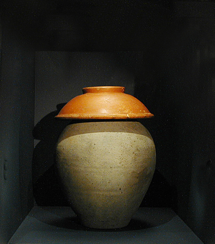 Two thousand years ago someone who died amid the Upchurch potteries was cremated and buried there in this locally made jar. It was found covered by the accompanying imported Samian Ware dish made by the Rheinzabern potter Statutus (ca. 160200 A.D.). The burial site consisted of a semi-circle of similar Upchurch urns that contained the remains of puppies. The deceased canines probably were part of a votive offering to the god Robigus, protector of wheat from blight.
