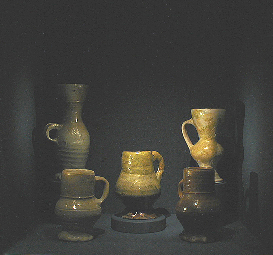 At first the preferred shapes were somewhat eccentric, like the funnel-mouthed form being made in an image of about 1455 (to your left). Stonewares in this style (1) were widely used in England, as evidenced by an earthenware version made in Surrey around 1540 (2). Most German beer mugs from the first half of the sixteenth century were more practical and far less elegant (3 and 4). Potters working in the London area did their best to copy these forms in lead-glazed earthenware (5).
