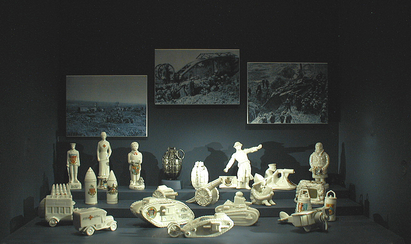 There is irony in the fact that the bloodiest war in history spawned the whitest of souvenirs. Inspired by Adolphus Goss and his heraldic china, several competitors produced slip-cast models of virtually every tool of the conflict, from the buses that carried troops to the front to the ambulances that carried them back (2 & 3).