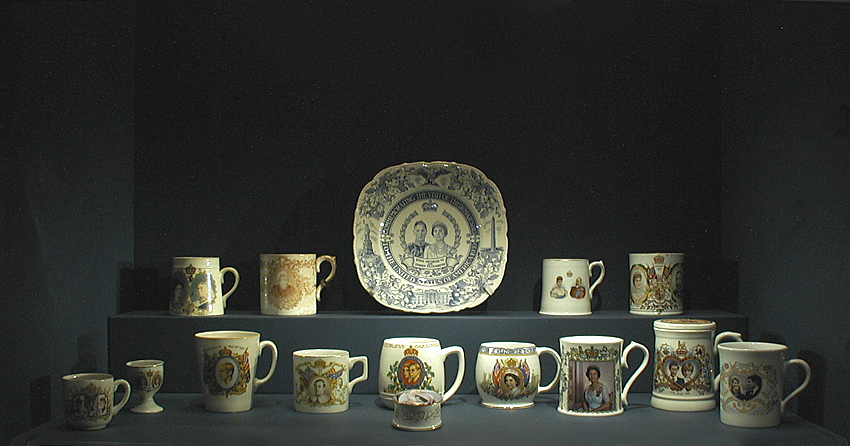 A faded black ribbon around the mug made to commemorate Victorias Diamond