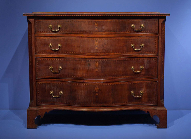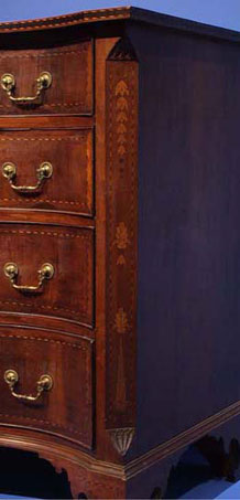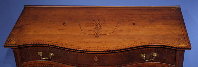 Cherry, cherry veneer, mahogany banding, and lightwood and darkwood inlays with white pine