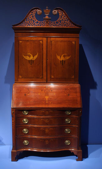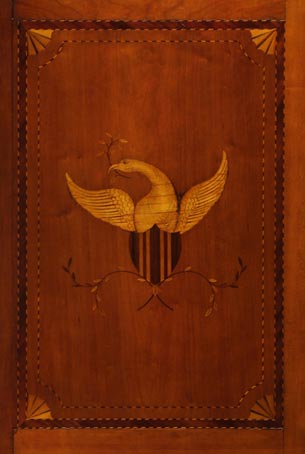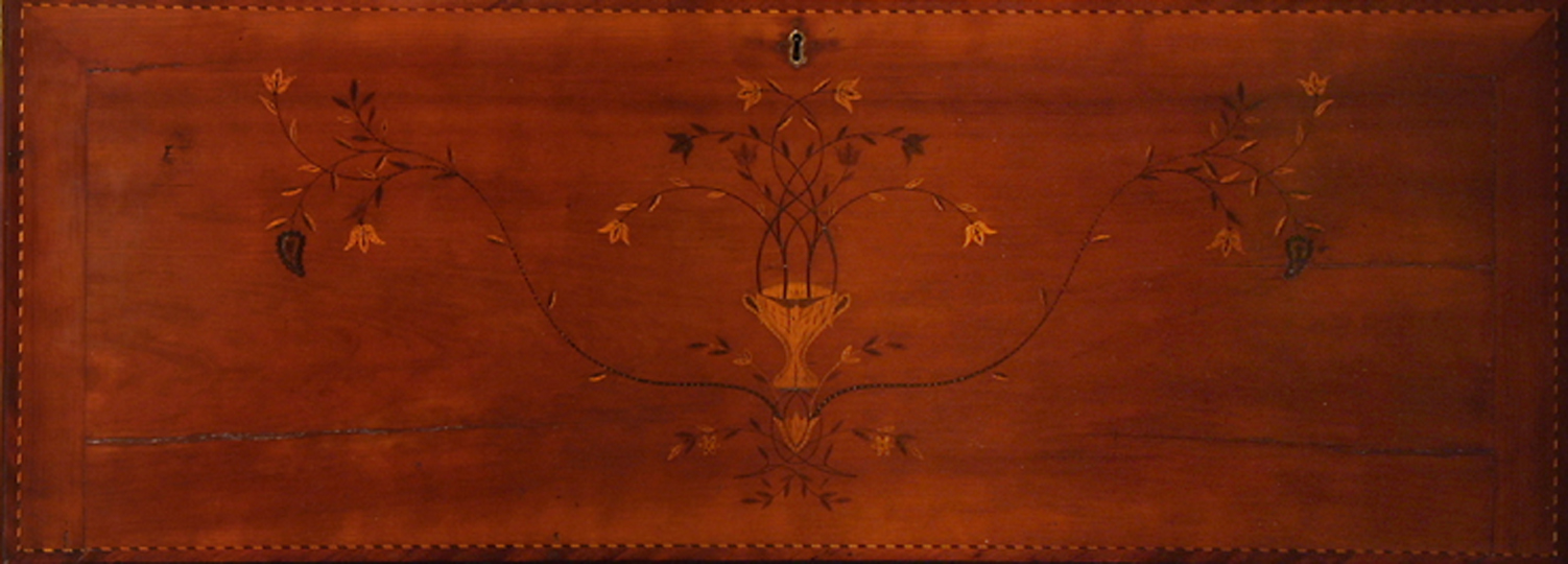 Cherry, cherry veneer, mahogany banding, and lightwood and darkwood inlays with white pine