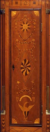 Cherry, cherry veneer, mahogany banding, and lightwood and darkwood inlays with white pine