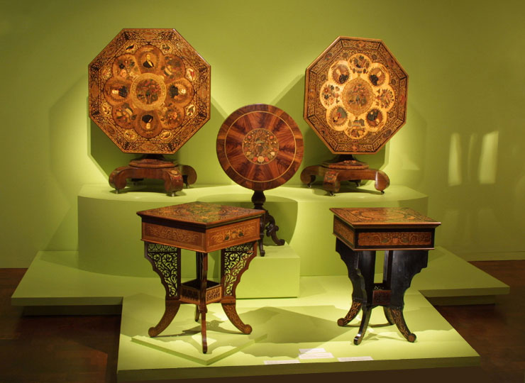 Ambition led the Wisconsin craftsman to tackle monumental projects and venture into self-promotional marketing. In 1864, Glass spent six months designing and creating a large, tilt-top center table with over 20,000 pieces of wood composing marquetry portraits of political and military heroes and intricate floral and geometric displays. This table is now owned by the Governors Mansion of Illinois and seen in this exhibition. Glass displayed this piece and its companion worktable in Milwaukee and Chicago for 25 cents admission before sending the works to their intended recipients, President and Mrs. Abraham Lincoln (unfortunately Lincoln was assassinated before the pieces arrived). Though described in The Chicago Tribune as "a Wisconsin backwoods man," Glass was both a sophisticated and prolific furniture maker. Three other heavily ornamented center tables survive, including one that is currently on view at the Milwaukee Public Museum. Late in his life, Glass made several gifts for family members, including numerous small boxes and eight worktables (three of which are seen in this gallery).