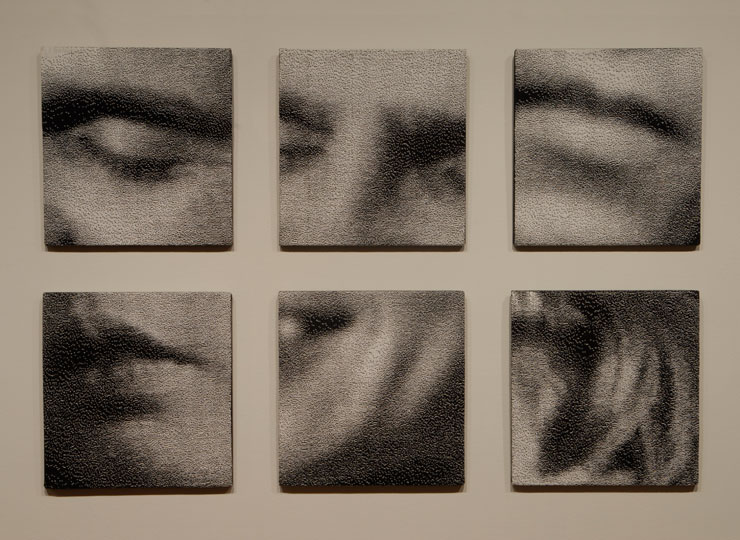 Lisa Cook weaves intimate portraits using a Jacquard loom that is hand-operated but augmented with digital controls. Face Mops Revisioned: Lips and the sixpanel Face Maze Three Generations show the dynamic interplay between eighteenth- and twenty-first-century technology. Cook deftly and deliberately manipulates the aesthetics of the loom using two binary systems—the warp and the weft of the threads, and the zeros and the ones of the digitized images. This process magnifies the topography of the face just enough for the portrait to be visible from afar, but the image becomes increasingly fragmented (and the weave more apparent) as one moves closer. We are left to wonder whether these are portraits, textiles, or something new altogether.