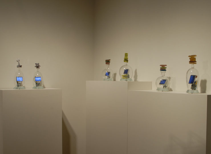 Tim Tate’s series of works include uniquely crafted glass reliquaries that campaign against the demise of the book in the digital age. One work, Memories of Reading (2008), speaks directly to the joy of reading by showing images of book pages appearing and disappearing in and out of focus. Tate evokes sentimentality to reaffirm the importance of an object that some would claim is already obsolete. Within the glass encasements, preserved, dynamic testimonies spin tender stories of love. Tate explicitly represents the New Materiality continuum, with craft tradition at one end, digital technology at the other, and romantic narratives within a series of five evocative sculptural forms that lie somewhere in the middle.
