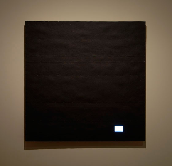 In this work, Wendy Maruyama recalls her childhood innocence when watching Saturday morning cartoons. She did not know then that some of the cartoons, including the 1942 cartoon named in the title of the piece, functioned as deliberate anti-Japanese propaganda. You’re a Sap, Mr. Jap reveals the inappropriateness of such blatant racism for children, and questions the television executives who knowingly aired the programming. The tarpaper—the same material used in the construction of Japanese interment camps in the United States during WWII—stands as a reminder of the catastrophic effects experienced by Japanese Americans because of such propaganda.