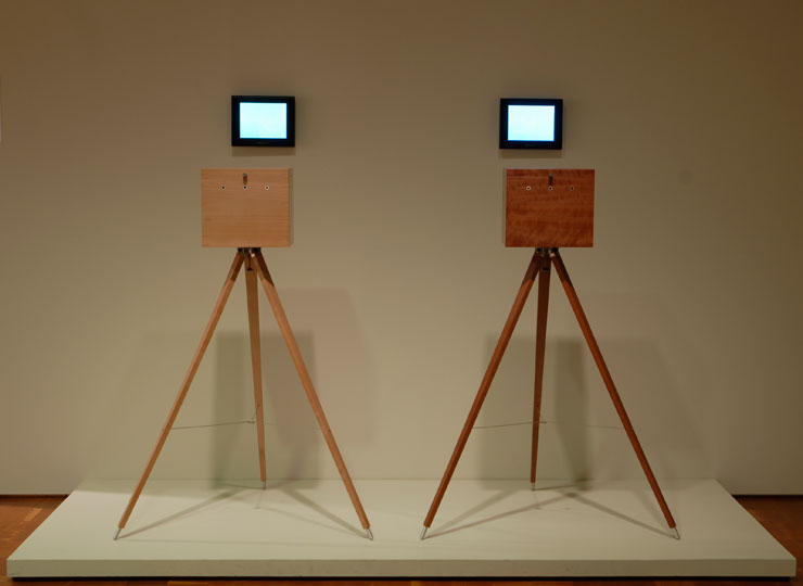 Under the Bridge, Fortescue focuses on geography as an expression of his own dual sense of identity. The representations of water inlaid onto the lids of the twin cabinets and projected on the wall appear to be identical. But the actual bodies of water exist thousands of miles apart. One of the videos depicts water from under the Sydney Harbor Bridge in Austrailia, his homeland, while the other depicts water from under the San Francisco Golden Gate Bridge, the city where he currently lives. A sculptor originally trained as a furniture maker and designer, Fortescue creates work with close attention to process and materiality. The two finely crafted cabinets-on-tripods resemble historical cameras and the metallic mounts at the top of the legs are century-old pieces of hardware that were made in San Francisco.