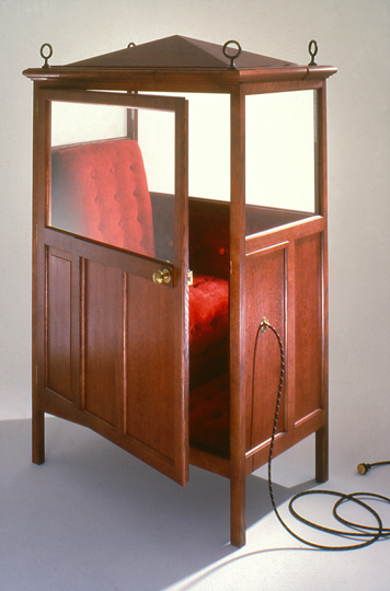 Ark is Peteran’s most complex and monumental work. The quarter-sawn red oak panels that make up the exterior project at unexpected angles, each with a slightly different configuration of slanted framing elements. Bronze rings top each corner, suggesting that the whole work is meant to be portable, perhaps through the agency of ceremonial bearers armed with long poles. The interior is luxuriously upholstered in plush, hand-tufted red velvet. The overall form brings to mind a bewildering variety of furniture-related precedents: a sedan chair, a confessional, a throne, a stagecoach, a psychiatrist’s couch, a specimen cabinet, a phone booth, and even an electric chair. The last association is particularly strong because of the mysterious black electrical cord that snakes away from the piece. When a person enters Ark and closes the door, an overhead light automatically illuminates. Suddenly the user is put on view, enclosed in a luxurious but airless chamber. When in use, Ark becomes a double-edged and many-layered metaphor that calls forth numerous oppositions: exhibitionism and privacy, coziness and claustrophobia, display and functionality, privilege and death.