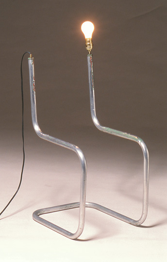 Peteran draws almost constantly, an artistic exercise that finds its way into his work in surprising ways. Electric Chair consists of the tubular steel frame of a found Marcel Breuer–style chair, a cord, and a light bulb. The artist has described the work as “a drawing in space.” The piece is one of Peteran’s simplest and most direct ideas—a fact that may be recognized in the bulb, which (as in a comic strip) seems to declare, “eureka!”