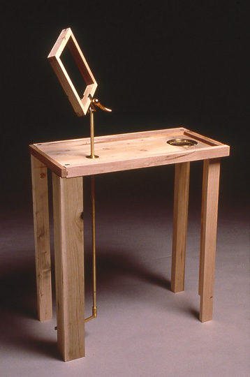 The table titled Best General View belongs to a client of particular note, William Anderson. Or at least, one version of it does. The second version is a permanent fixture in Peteran’s home. The two tables exist in symbiosis, making one work between them. They implicitly regard each other “like a sight in a gun,” as Peteran has said. Other metaphors might include the lenses of two facing cameras or telescopes, or perhaps, given the rectangular frames, two mirrors reflecting one another into infinity. As is suggested by Peteran’s seemingly contradictory title, both artist and client occupy the “best” vantage point on the work, but at the same time, each is the subject of the other’s surveying (“general”) gaze.