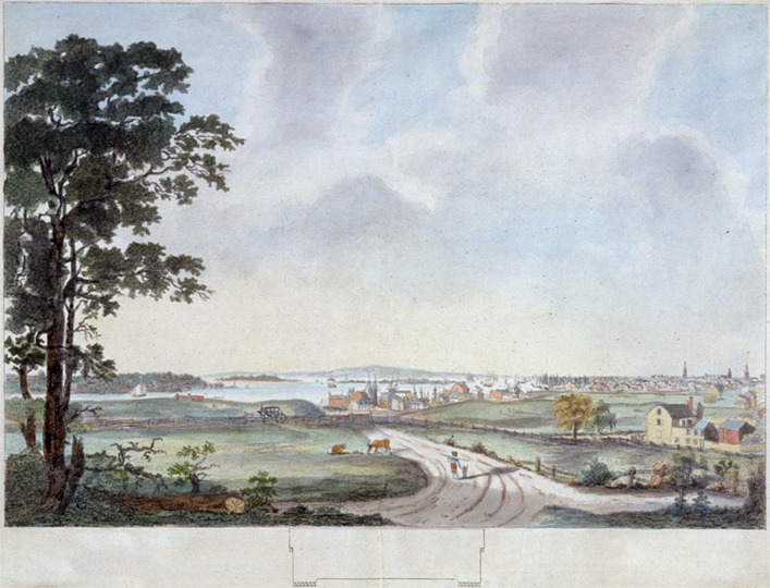Saint-Mémin sketched New York City from the porch of his friend John R. Livingston’s house. Livingston convinced Saint-Mémin not to send the drawing back to London but rather to have it engraved in New York where the publishing industry was growing dramatically. This particular print shows the image still in a preliminary state. Notice the blank box below the picture, where later versions include the title “View of the City and Harbour of New York, taken from Mount Pitt, the Seat of John R. Livingston, Esq.”