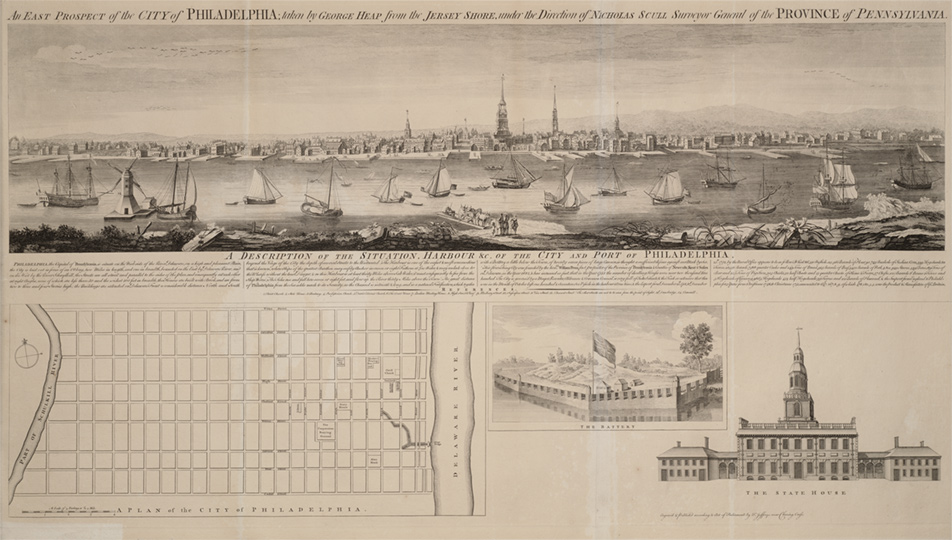 Thomas Penn, William Penn’s son, held three-quarters of the proprietorship of Pennsylvania and therefore had a strong interest in attracting settlers to rent or buy his land. In 1752 Penn commissioned a print to publicize Philadelphia’s prosperity but was dissatisfied with the final product. It was too large—more than six feet long —and did not show Philadelphia as a protected inland port. To resolve these problems, Penn hired Thomas Jefferys to re-engrave the view on a smaller scale with the addition of the New Jersey shoreline. Jefferys also added inset pictures of the downtown grid plan and views of the Battery and the State House to further show Philadelphia as a well-ordered city.