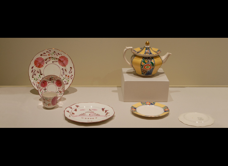 Thorley became director of design at Charles Allerton’s pottery in 1924 or 1925. He realized that the factory had never stopped producing “Luster,” a type of metallic surface decoration popular throughout the nineteenth century but long out of style by the 1920s. The shiny surface of pink luster was created by adding tiny amounts of gold to the glaze, which was still being hand-applied by an elderly employee named Mrs. Woolley. She had learned the technique as a young woman in the 1840s from “Old Diana” who had learned the technique during her apprenticeship at Allerton’s parent company in the 1820s. Thorley recognized the aesthetic and commercial value of this unbroken tradition and he encouraged Mrs. Wooley to teach the application of luster to young employees. Before long Allerton lusterwares that harkened back to the originals were commercially available.