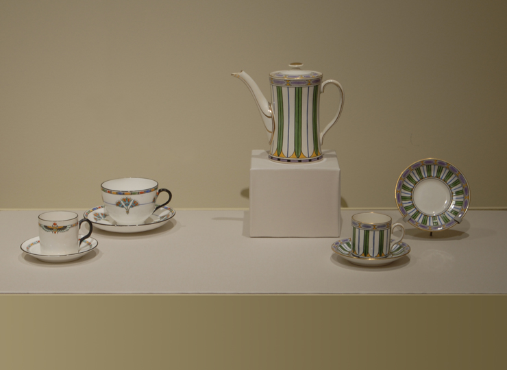 Thorley was especially intrigued by the culture and art of ancient Egypt. When he learned in 1923 that the artifacts from the tomb of King Tutankhamun were to be displayed at the British Museum, he decided to create a series of wares featuring Egyptian motifs. Inspired by this newspaper clipping of ladies’ hats in the Egyptian style, he used a scarab motif as the basis for the tea and coffee service seen here. A “big seller,” as Thorley remembered, this set was prominently displayed in the Oxford Street window of London’s W. Savill & Company Porcelain House.