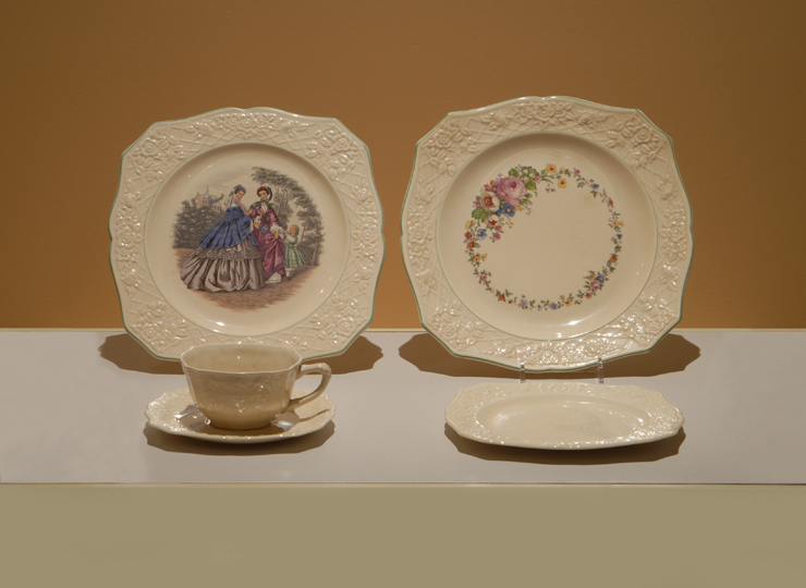 In the year after Thorley designed the modernist “Nouvelle” shape he created the more traditional Briar Rose pattern. Its trellis molding around the rim harkens back to eighteenth-century styles. One example seen here features a decal of several strolling ladies, which was taken from Godey’s Ladies’ Book, a popular nineteenth-century magazine. Stiff competition among independent contract designers led Thorley to patent several of his designs in the 1930s.