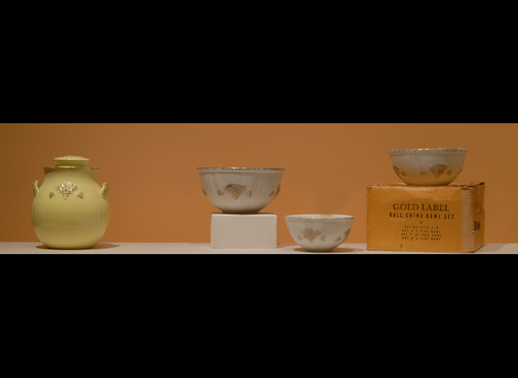 The “Grape” model from Thorley’s Brilliants teapots series inspired a matching line of kitchen wares. Examples of the nesting mixing bowls and the cookie jar are shown here with an original box. Casseroles can also be found with this decoration. Because these wares were meant to be more practical than showy, the rhinestones were not an available option.