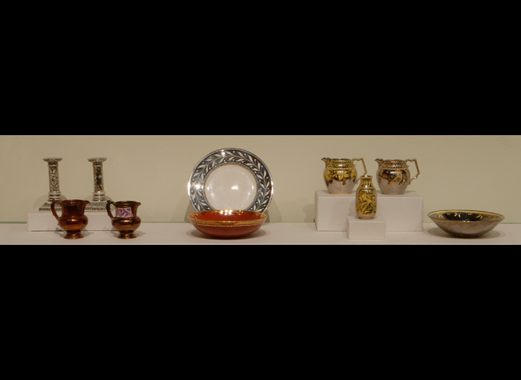 To recreate the silver luster jugs that were found archaeologically in Virginia, Thorley turned back to time-honored methods. He used a wax resist technique to draw pictures of birds and flowers onto vessels and silhouette them using metal oxides that turned shiny when fired. Employing the recipes he remembered from England, Thorley used silver and copper on different colored clay bodies. He used gold to make pink luster. Even after he stopped working for the Craft House, Thorley continued to invent new historically-based patterns in lusterware.