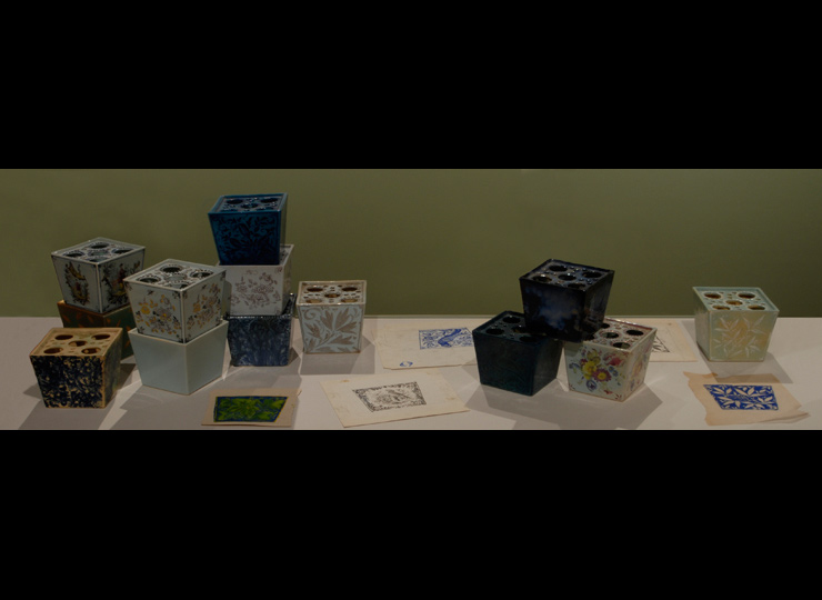 One of Thorleys most popular historical reproductions was the jardiniere or flower brick, a form originally made to display cut flowers. Williamsburg’s Craft Advisory Committee only chose one historic pattern to sell, even though Thorley developed many for consideration. As the decoration was easy to work on the flat square sides, Thorley continued to make a wide array of flower bricks in later years. He sold a them in his studio and in regional gift shops. Over fifty of his watercolor sketches for flower brick designs like these survive.