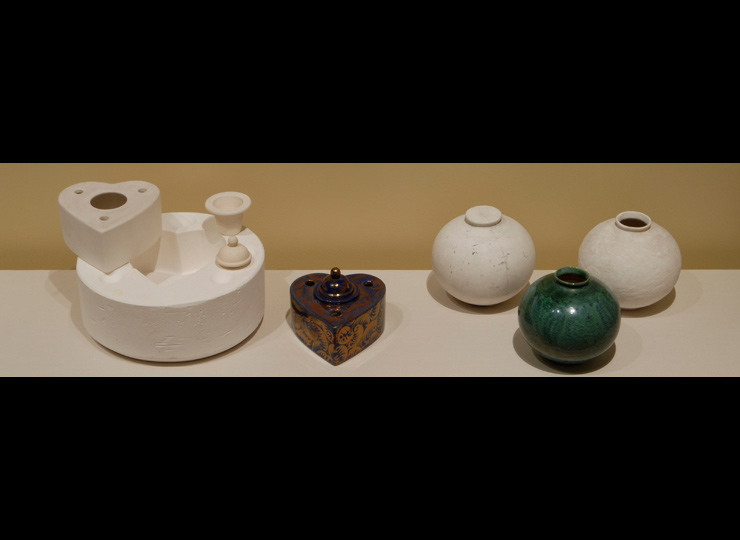 Working mold, unglazed, and finished inkwell in dark blue and gold luster.