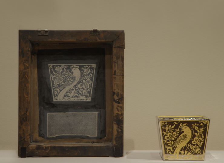 Although hand-painting was Thorley’s primary interest, he also used silk-screen techniques. As seen here, Thorley worked out the design on paper and then applied it to a thin sheet of silk in a wooden frame. He laid the silk on the surface of an object and applied a layer of colored glaze on top. The glaze only seeped through the silk where the pattern had not been applied, a technique much like resist printing or stenciling. On occasion Thorley would silk screen the outline then hand-paint the details using the printed design as a guide. Examples of these printing processes are visible on many of Thorley’s flower bricks.