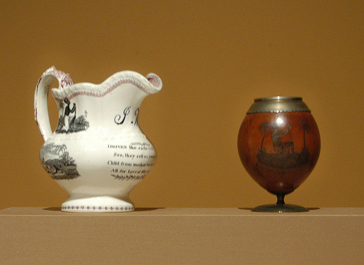 English abolitionist groups donated great numbers of artifacts to American organizations, which in turn sold the pieces at fairs and public meetings to raise money for their cause. Some of these abolitionist art forms depict the horrors of slavery, which Benjamin Franklin had described as "this pestilential detestable traffic in the bodies and souls of men." The pitcher seen here shows the dehumanizing practice of selling people at auction on one side and a scene of a slave being beaten on the other. Both scenes are set on a tropical island, a locale also evoked by the mounted coconut shown here. Although Toussaint LOuverture and his allies had ended colonialist rule and forced slavery in Haiti, countless other people throughout the Caribbean region remained in bondage.