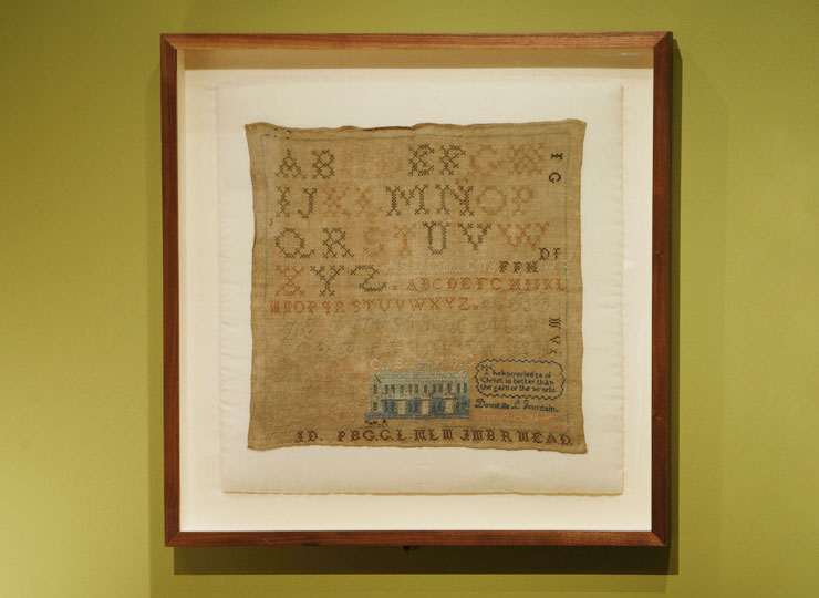The needlework sampler Jourdain created as a young woman demonstrates a new influence in her community—Protestant missionaries arriving from New York and Pennsylvania. The building depicted on the sampler is the 1833 addition to the Protestant Episcopal Mission School, which was established in Green Bay in 1826 and which Jourdain almost certainly attended.