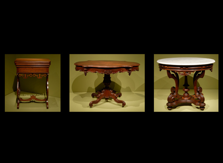 The 1836 census for the Wisconsin Territory recorded just over 11,000 settlers. By the time Wisconsin achieved statehood in 1848 the population was approaching 300,000, and by 1860 it jumped to 770,000. To meet the increasing consumer demand in the region, many merchants and craftspeople in the east moved to the Western Country to take part in the rapidly expanding economy. Among the first cabinetmakers to settle in Milwaukee was John Francis Birchard, who came to Wisconsin from New York City in 1845. By 1860 he was the proprietor of the second-largest furniture factory in the city with a workforce of twenty men. Birchard’s clients included Louis Dousman of Prairie du Chien, who purchased the marble-topped center table shown here in 1871 for the Villa Louis, his elegant estate. More examples of fashionable furniture from the Villa Louis, now a historic site operated by the Wisconsin Historical Society, are documented in the Wisconsin Decorative Arts Database.