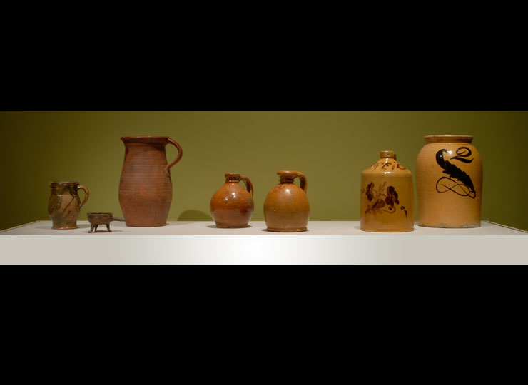 Potters in early Wisconsin took advantage of the region’s rich natural resources. Earthenware makers dug locally for their red and yellow clays, mixed glazes from lead mined in the southwest part of the state, and powered kilns with wood from nearby forests. They supplied the settlers in their own and surrounding communities with a wide variety of forms including jars, crocks, pots, and churns for food storage and preparation.