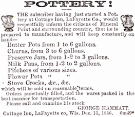 George Hammett left Devon, England for America around 1850 and established a pottery in Cottage Inn, Lafayette County with his two sons.