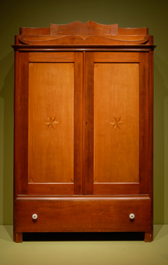 These stylish schranks or wardrobes represent the continuation of German cabinetmaking traditions in the Milwaukee area. The first major wave of Germanic settlement in Milwaukee, from 1845 to 1860, included German-speaking immigrants from Alsace, the Rhine Valley, Bavaria, Prussia, Belgium, Luxembourg, and Switzerland. Many skilled craftspeople were among these settlers, including cabinetmakers who learned their trade under the rigorous apprenticeship system in Europe. The artisans who made these wardrobes were probably among the small number of cabinetmakers who continued traditional craft practices and made furniture for the German-speaking community. Many other European-trained furniture craftspeople were unable to compete with successful Yankee merchant-manufacturers like John F. Birchard and A. D. Seaman and, instead, found work as day laborers in these large shops.
