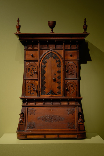 John W. Cleveland made this hanging cupboard while working as a wagon maker in the city of Union Grove, Racine County. Born in New York State, Cleveland came to Wisconsin in 1864. The fretwork on the outer doors includes Cleveland’s initials as well as initials of unidentified individuals. The fretwork on the interior of the cupboard is even more intricate, featuring rural scenes including a farmhouse, maple trees and deer, as well as the text “J.W. Cleveland, Union Grove, Jan Wis, 1886.”