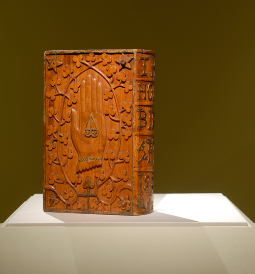 According to tradition, Richard Ryan of Eau Claire carved this book-shaped box from the wood of a tree that fell on him during a logging accident and broke his leg. Ryan boldly asserted his identity on the book’s spine, which reads “The Holy Bible by RR 1883.” He also represented religious and community affiliations in the multiple crosses and the hand holding a heart, a symbol used by several fraternal organizations including the Masons and the International Order of Odd Fellows. The velvet-lined interior features two lithographs of children dressed in folk costume.