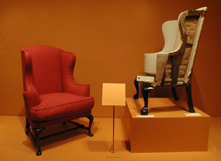 Fakers often re-use parts from period objects to expedite and simplify their work. The individual who produced this fraudulent easy chair on the right married the frame of a mid eighteenth-century Massachusetts easy chair with fake legs and stretchers of the sort found on Newport, Rhode Island furniture.