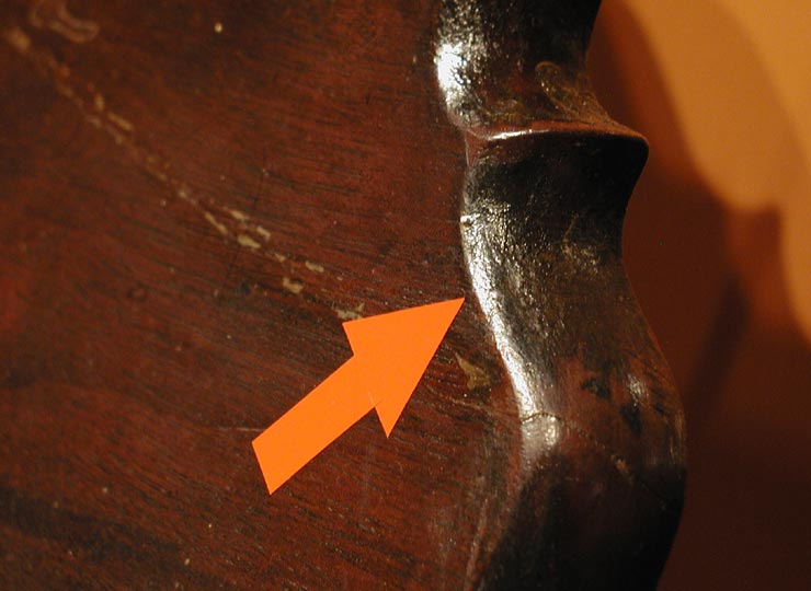 | Artificial accumulation of finish In several areas the faker attempted to simulate a thick mulit-layered finish. To achieve this affect he probably reapplied dirty finish stripped from another form. | ![]() |