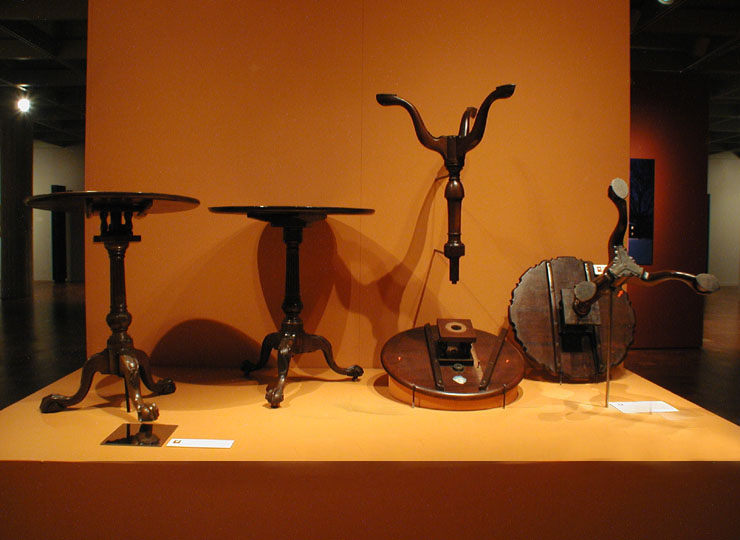 | Candlestand American, c. 1959 Mahogany Lent by the Chipstone Foundation 1959.4 Candlestand Philadelphia, 1765-1775 Mahogany Lent by a private collection The dealer who sold the Stones the stand on the left noted that only three or four other Philadelphia examples had such rich carving. He also assured them that the object was genuine and had no major repairs. In reality, the entire table is new, and the carving is by the same person who forged many of the other fakes in this exhibition. Several related stands and tea tables by this faker are known, most of which have an unconventional compressed ball turning on the pillar, poorly designed and ineptly carved leaves, and exaggerated claw-and-ball feet. Upon closer inspection, the carving appears significantly different and less sophisticated than that on early Philadelphia tables, including the candlestand to the right. |