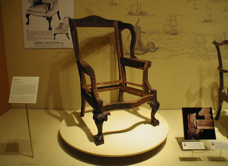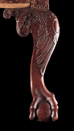 ornament In hindsight, we now see that in comparison to the original all of the fake Gratz easy chair have poorly executed carving, which aside from its basic design has almost nothing in common with period workmanship. The work is contrived and overwrought, and the unusually sharp spines separating the leaves and divergent veining have no precedent in eighteenth-century Philadelphia carving. |