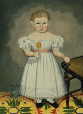 Erastus Salisbury Field, Girl Holding Rattle, probably Lee, Massachusetts, ca. 1838. Oil on canvas. 34 3/4" x 25 1/2". (Courtesy, Abby Aldrich Rockefeller Folk Art Museum, Colonial Williamsburg Foundation, Williamsburg, Virginia.) Field often depicted his subjects standing on a Fancy ingrain carpet.