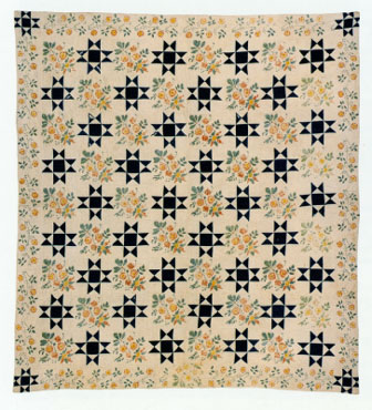 Counterpane, New England, ca. 1825. Cotton and painted and stenciled decoration. H. 92", W. 81". (Courtesy, Abby Aldrich Rockefeller Folk Art Museum, Colonial Williamsburg Foundation, Williamsburg, Virginia.) The design of this counterpane is based on the view into an equilateral kaleidoscope with three mirrors.