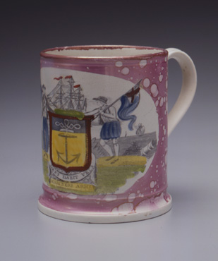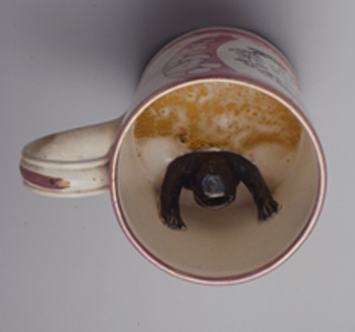Dixon and Company, frog mug, England, ca. 1825. Earthenware and polychrome, lustre, and transfer-printed decoration. H. 5 1/8 ". (Courtesy, Julie Elizabeth Hunter.)